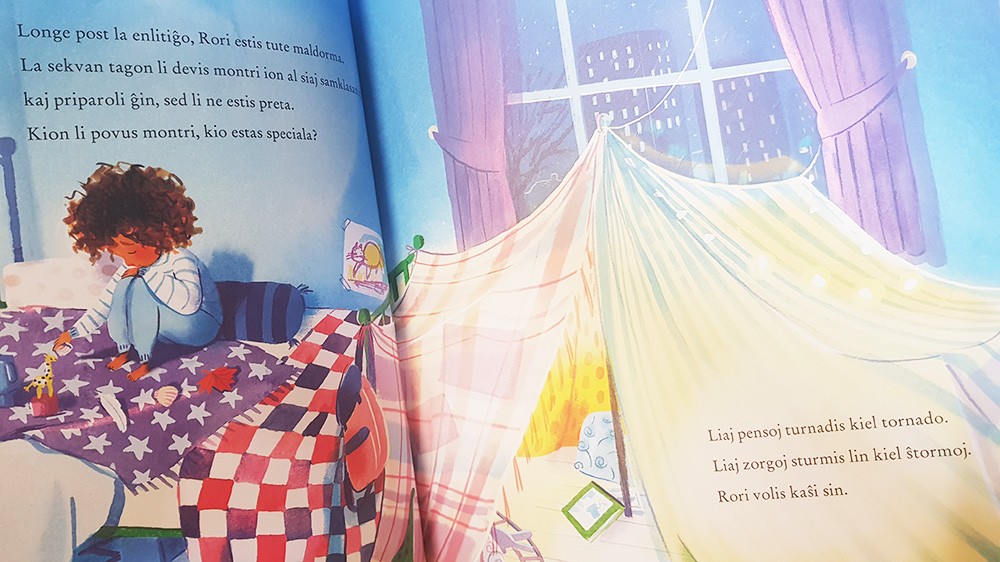 Written by Alexandra Page and illustrated by Stef Penney. First published as The Worry Tiger in English; translated into Esperanto by Jorge Rafael Nogueras.