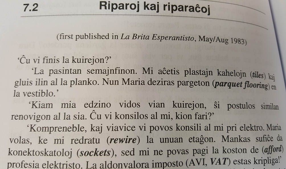 The more difficult expressions are followed by an English translation in brackets, and many of the articles have grammatical explanations too. The book also has English to Esperanto and Esperanto to English word-lists, with references to the pages where the words appear.